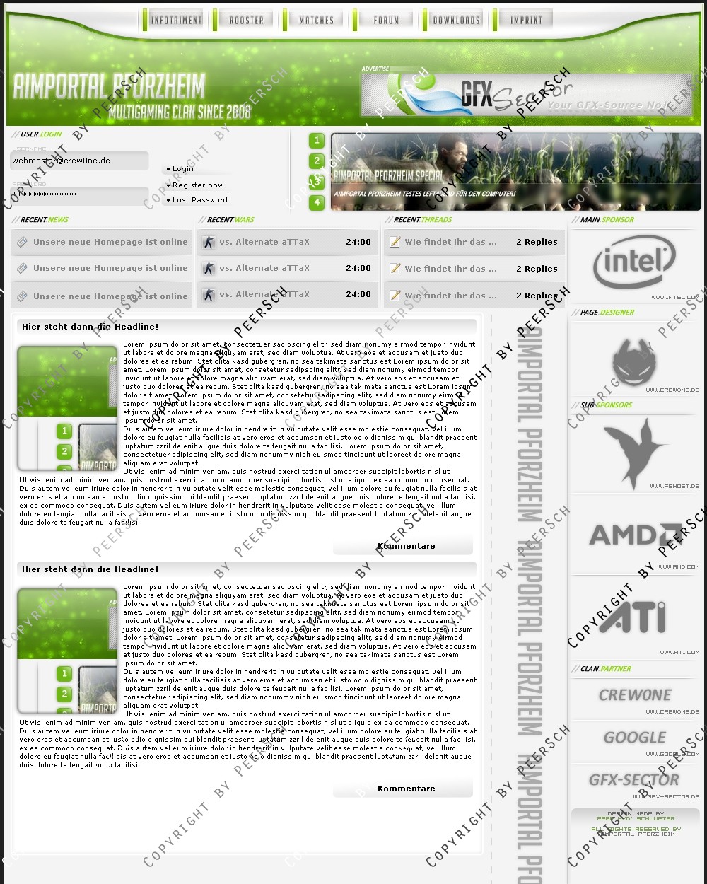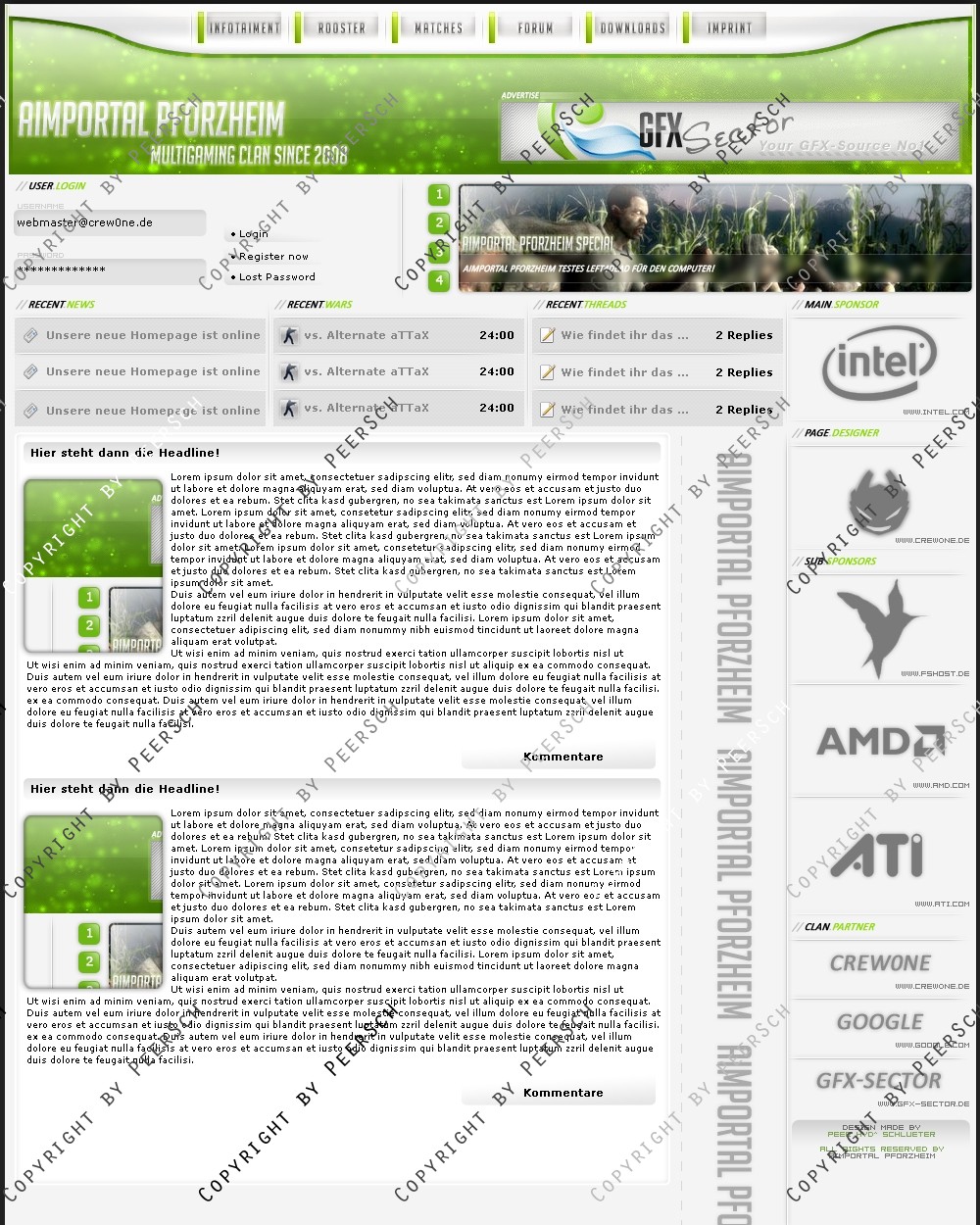 Zu einem meiner Meinung nach unschlagbaren Preis! Was Sie hier kaufen ist lediglich die PSD Datei, gerne kann ich es Ihnen gegen einen Aufpreis von 12,50€ an ein CMS Anpassen, zur Auswahl stehen hierbei: webSPELL, Clansphere, Teklab, Devilz und andere CMS auf Anfrage ohne Aufpreis.